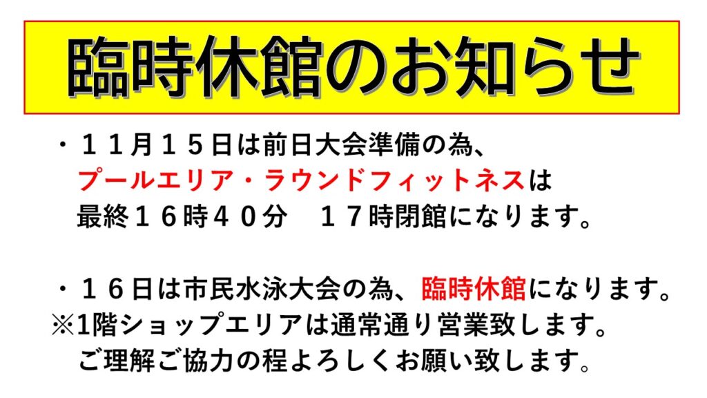 16日(日)は市民水泳大会の為、終日臨時休館となります。