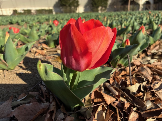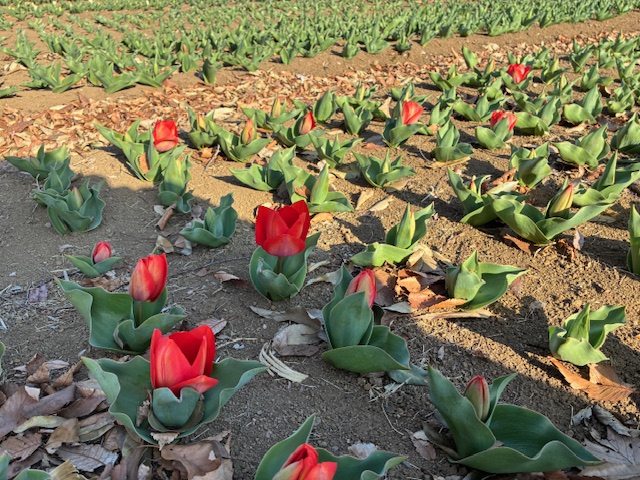 [春のパティオ、チューリップ編2026]Vol.5 チューリップ 2026.3.16 気が早い子が咲き始めてきてしまっています! まだ1色だけで、他の色の子はまだ蕾をつける準備をしています。 蕾がもっと高い位置になってから開花するのが通常ですが、低い位置で咲いてきてしまったことにびっくりです! 赤・白・黄・オレンジ・ピンクの5色、開花は2026年3月末から4月上旬を予定しています☆ また【春のパティオ、チューリップ編 2025】をお届けしますのでおたのしみに! <撮影日時:2026年3月16日(月) 午後 > 一覧へ戻る >